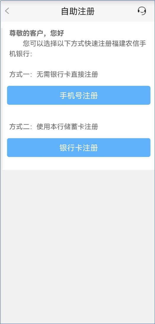 ①未簽約用戶進入登錄頁面,點擊“自助注冊”進入自助注冊首頁用戶可選擇方式一:無需銀行卡直接注冊->手機號注冊;或選擇方式二:使用本行儲蓄卡注冊->銀行卡注冊。