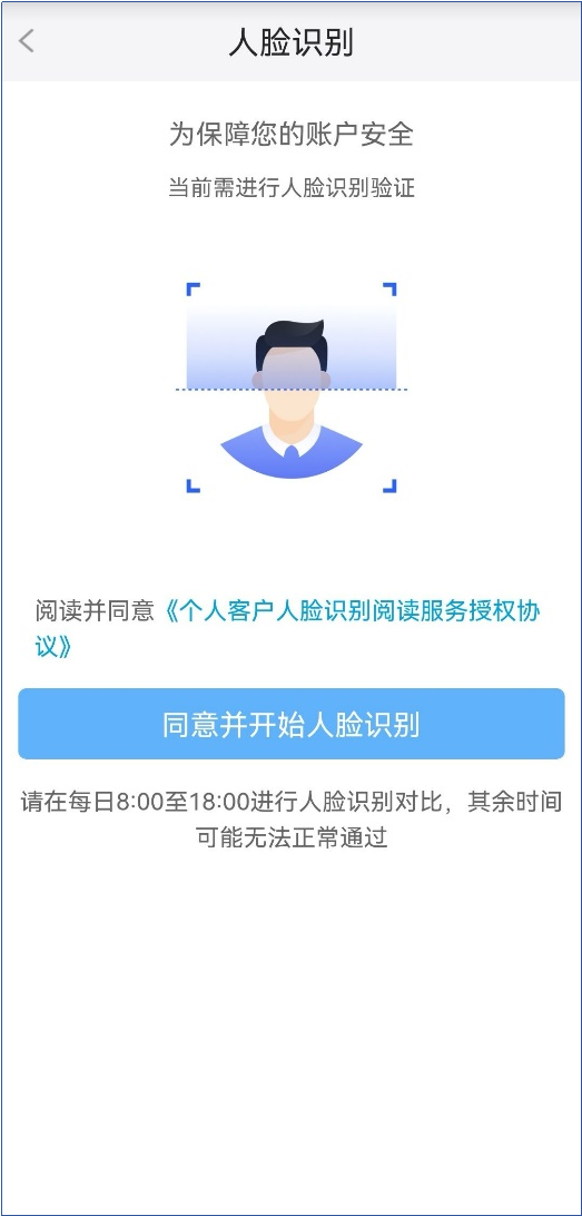 ④.用戶在人臉識別引導(dǎo)頁點擊同意并開始人臉識別,進入人臉識別頁面,按照頁面提示完成人臉識別。