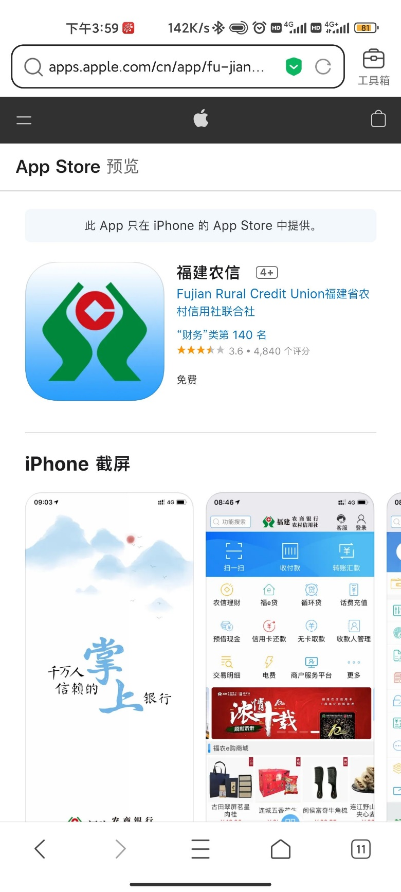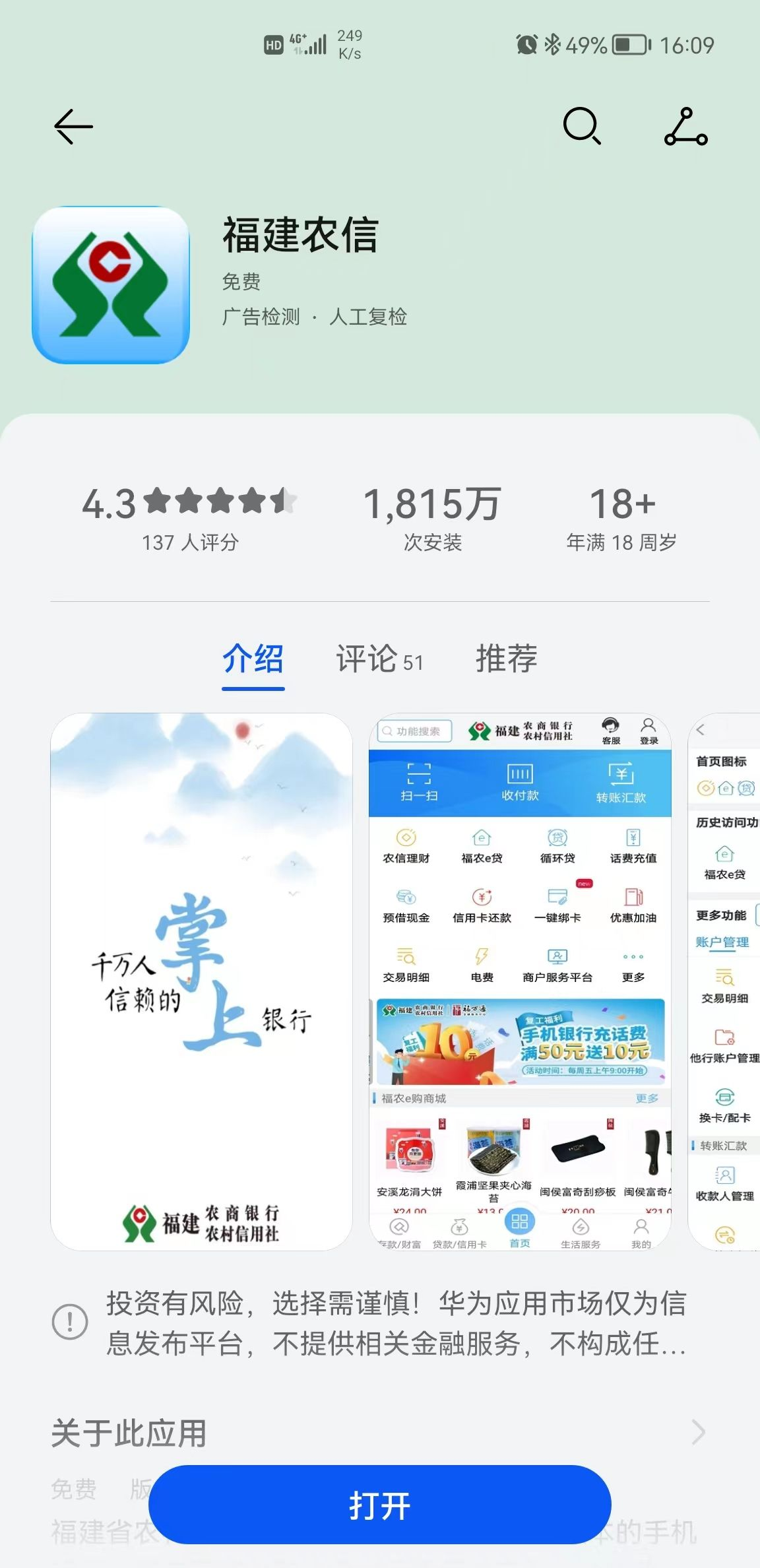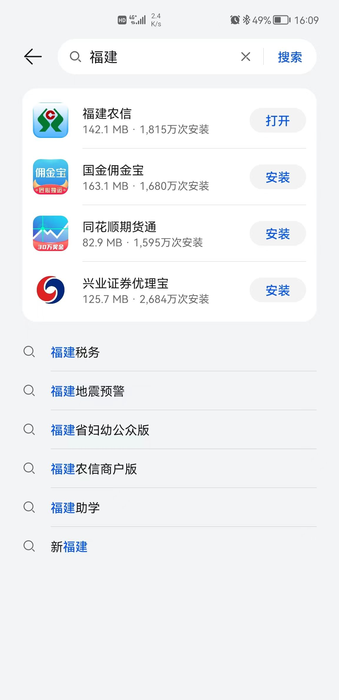 第二步:搜索結(jié)果中,選擇“福建農(nóng)信”,進入應(yīng)用詳情頁面,根據(jù)頁面提示進行安裝、升級、打開應(yīng)用等操作。