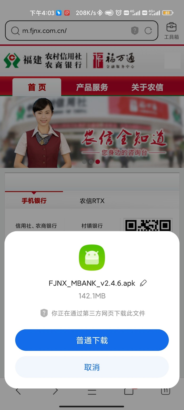 安卓手機用戶,點擊門戶網(wǎng)站“安卓手機版本”,根據(jù)瀏覽器提示下載安裝手機銀行。