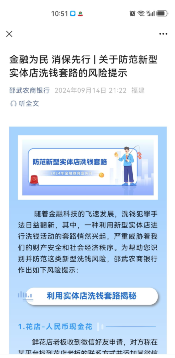 我行公眾號針對不同受眾群體和常見的金融風(fēng)險(xiǎn)類型,精心策劃了一系列風(fēng)險(xiǎn)提示推文。例如,推送了防范電信詐騙、防范新型實(shí)體店洗錢套路風(fēng)險(xiǎn)提示等方面的推文;對于《中華人民共和國消費(fèi)者權(quán)益保護(hù)實(shí)施條例》內(nèi)容的學(xué)習(xí)指南。