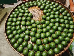 ? ? ? ?光澤文子,這道閩北非遺小吃,以鼠曲草汁融入米漿揉制成碧色外皮,包裹著鮮筍、香菇、肉丁等餡料。蒸熟后的文子咸香微辣,冬日里一口下肚,滿是熨帖的暖意。